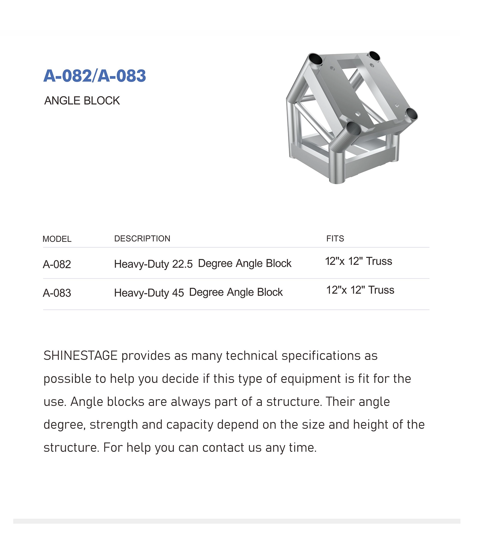 SHINESTAGE provides as many technical specifications as possible to help you decide if this type of equipment is fit for the use. Angle blocks are always part of a structure. Their angle degree, strength and capacity depend on the size and height of the structure. For help you can contact us any time.