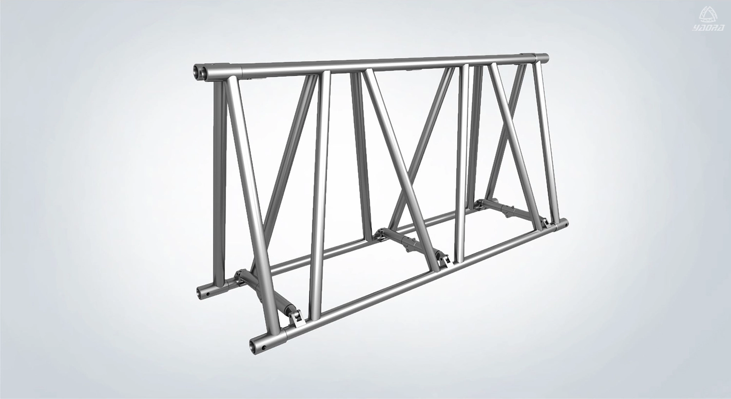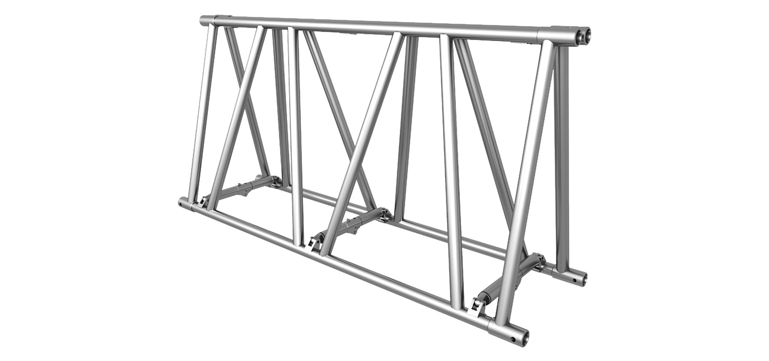 Capacity truss series for outdoor stages, concert stages or podiums featuring pin holes at 90 degree angles to the ground for convenient access on flat surfaces. Its foldable design can safe up to 75% truck or warehouse space, while the smart placing of the hinges prevents personal injuries.concert stage or podium will be well-served by the F102. Pin holes are located at a 90 degree angle to the ground for convenient access when truss is lying on a flat surface.
