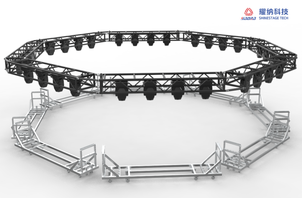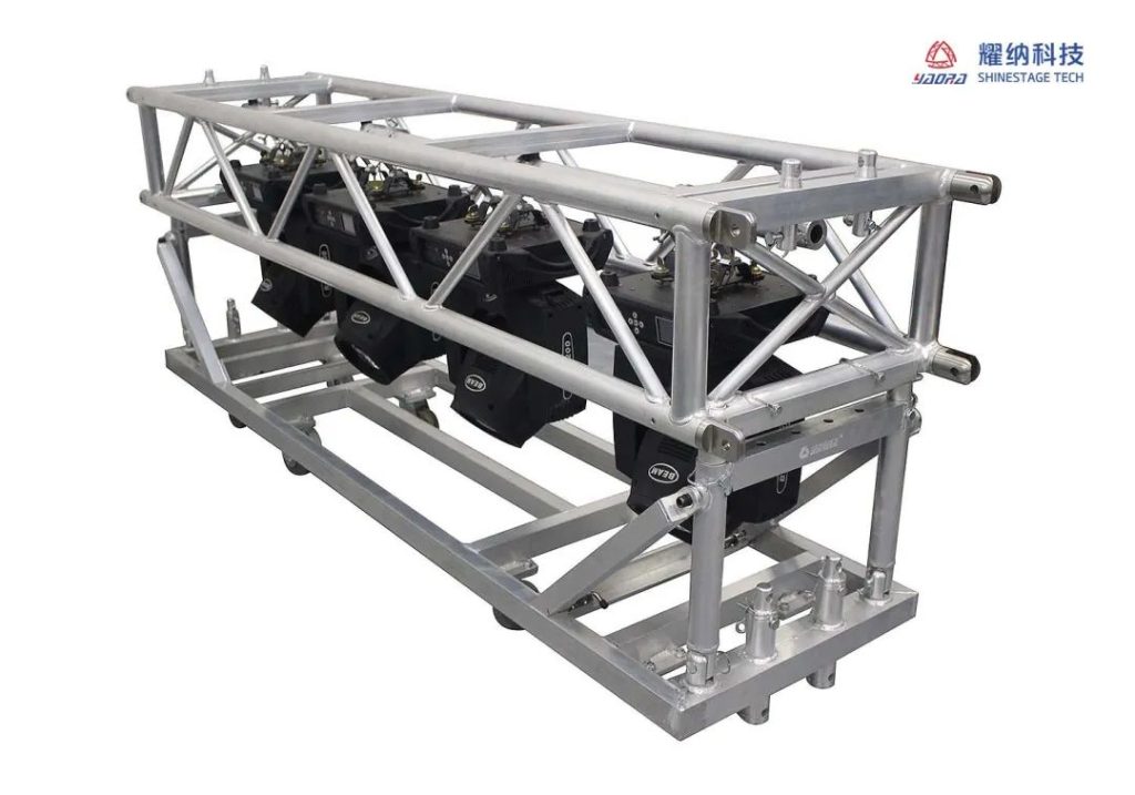 Next, we will introduce a SHINESTAGE patented product, the Track Truss, which is used for the pre installation of lighting lamps before and after construction, and for the performance in exhibition halls, gymnasiums and other venues. The lights can be installed in advance, tested, and combined with folding carts. After the performance, the lights need not be removed, but pulled away directly, saving installation and disassembly time, and optimizing a series of cumbersome processes such as warehousing, transportation, on-site installation, and storage. It solves the problem of low efficiency of truss construction in the exhibition hall. The US NBA sports venues have adopted our Track Trusses, which have been highly recognized by the users.