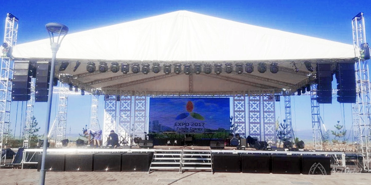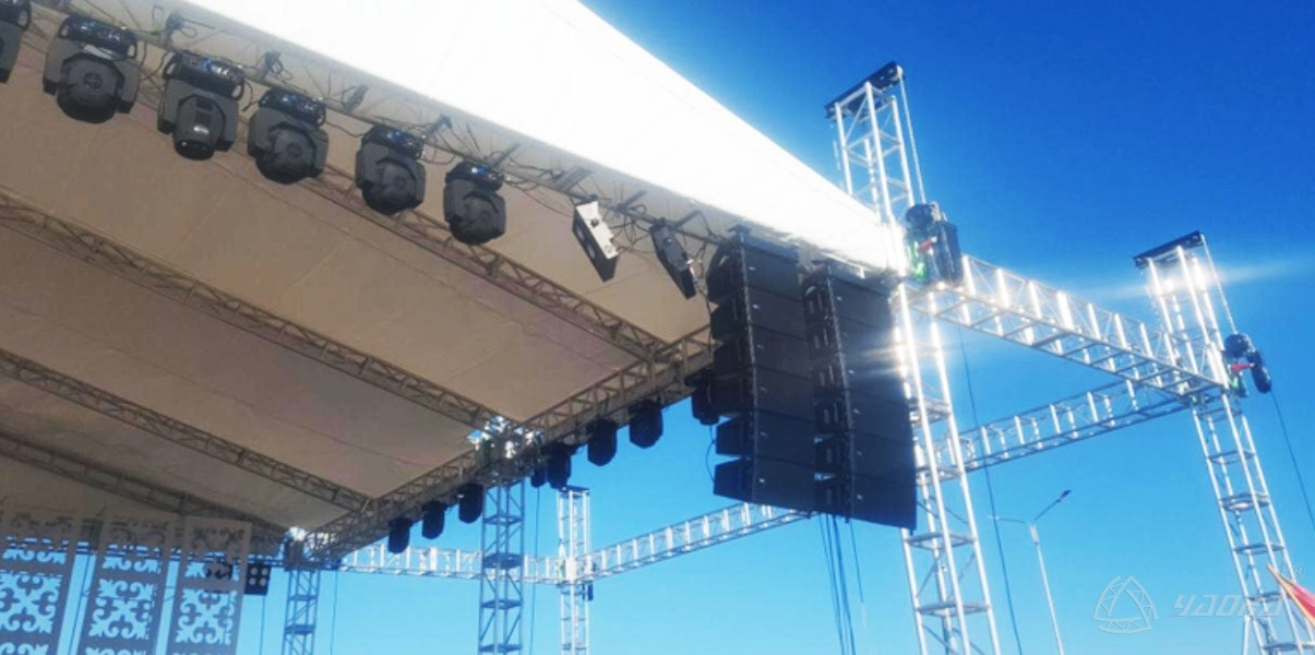 The triangle roof truss tent is consisted by 400x600mm beam truss and 400x400mm pillar truss with the canopy to protect the stage from water and sun. There are 8 pillars to support the system. The loading capacity of 20m span is about 500–700kgs. The wing box truss is for the line array speaker. Safety is guaranteed by the strong design and qualified truss.