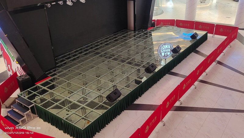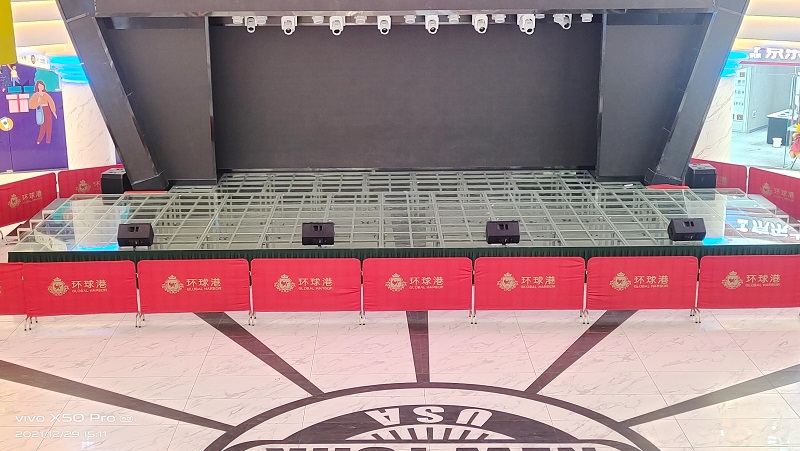 SHINESTAGE mainly provided 300 * 300mm square tube triangular arc truss, 1.22 * 1.22 * 0.8m tempered glass stage and 17.2 * 1.6 * 6.9m crown structure for this project.