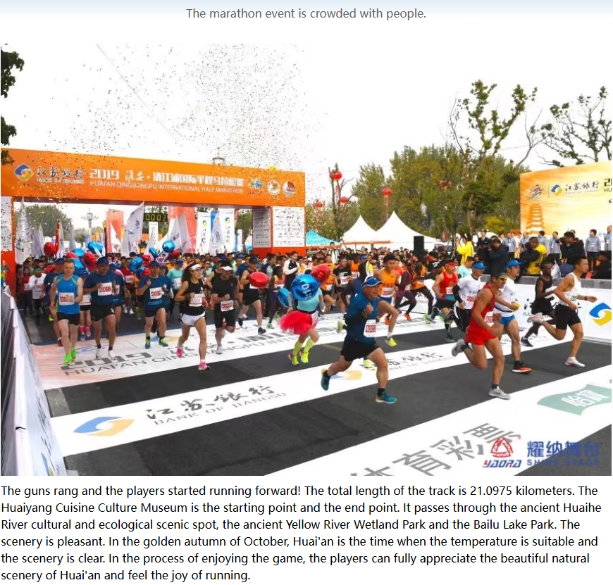 The guns rang and the players started running forward! The total length of the track is 21.0975 kilometers. The Huaiyang Cuisine Culture Museum is the starting point and the end point. It passes through the ancient Huaihe River cultural and ecological scenic spot, the ancient Yellow River Wetland Park and the Bailu Lake Park. The scenery is pleasant. In the golden autumn of October, Huai’an is the time when the temperature is suitable and the scenery is clear. In the process of enjoying the game, the players can fully appreciate the beautiful natural scenery of Huai’an and feel the joy of running.