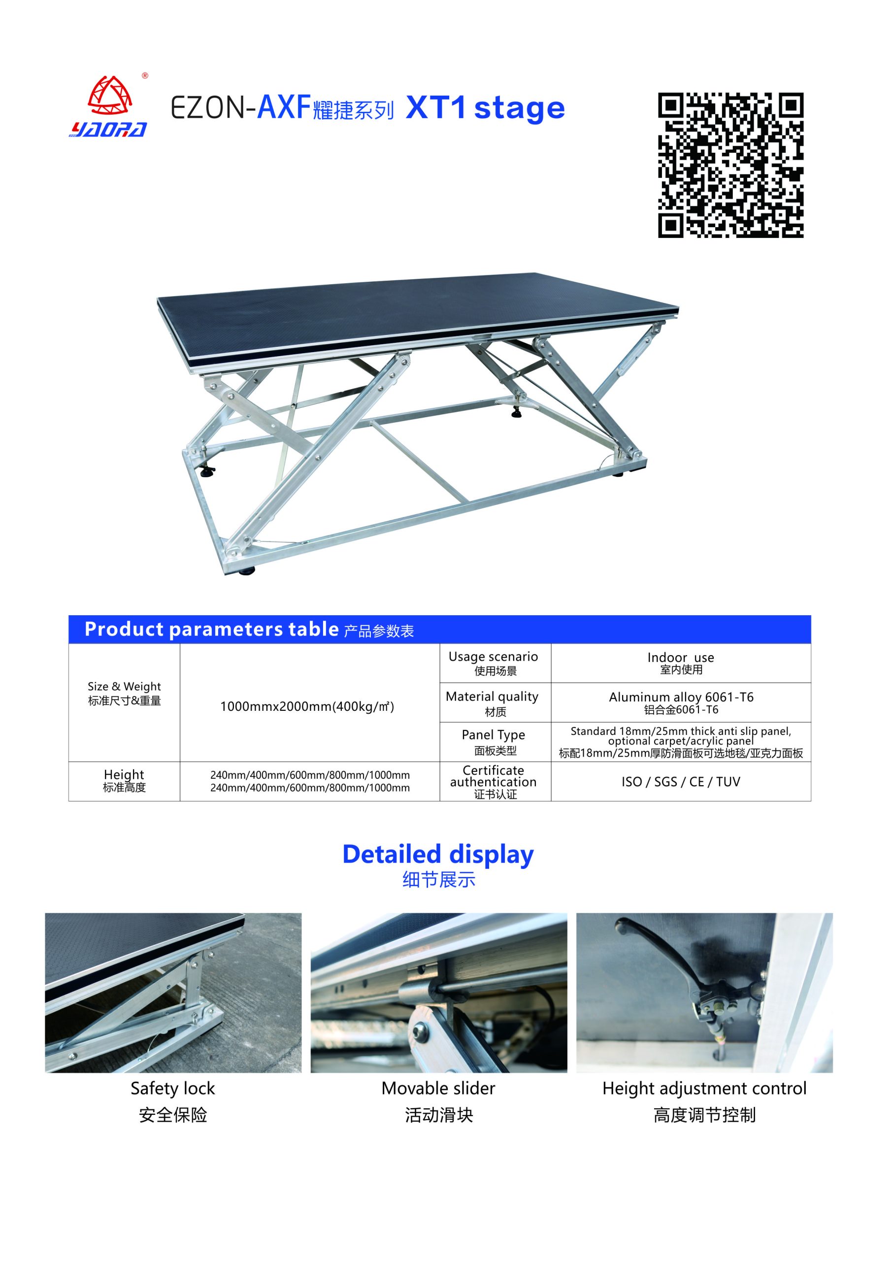 Sturdy & Safe: XT01’s materials include strong aluminum alloy frames and slip-resistant panels that ensure a stable performance platform, supporting 750kg/m² of load.