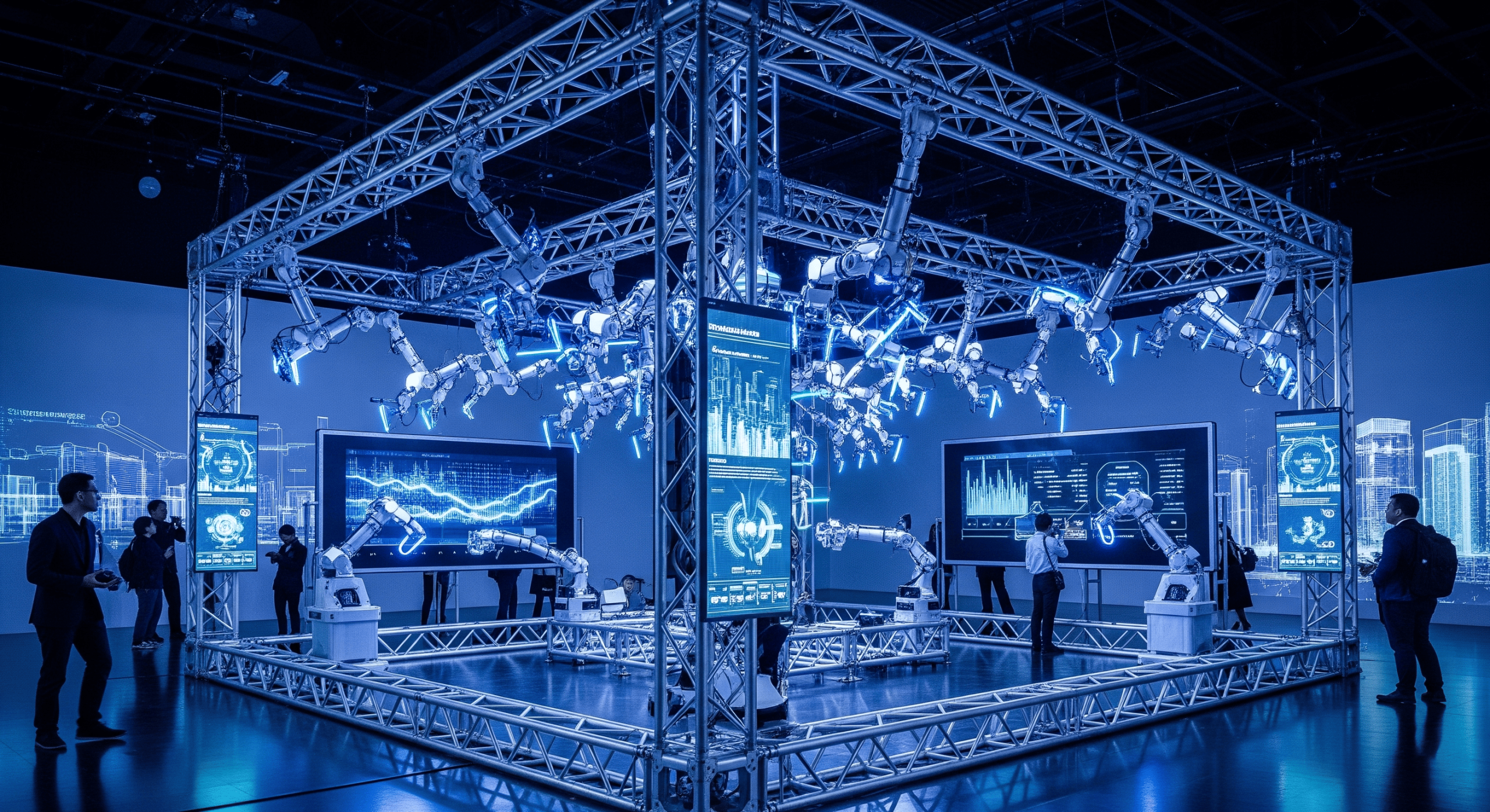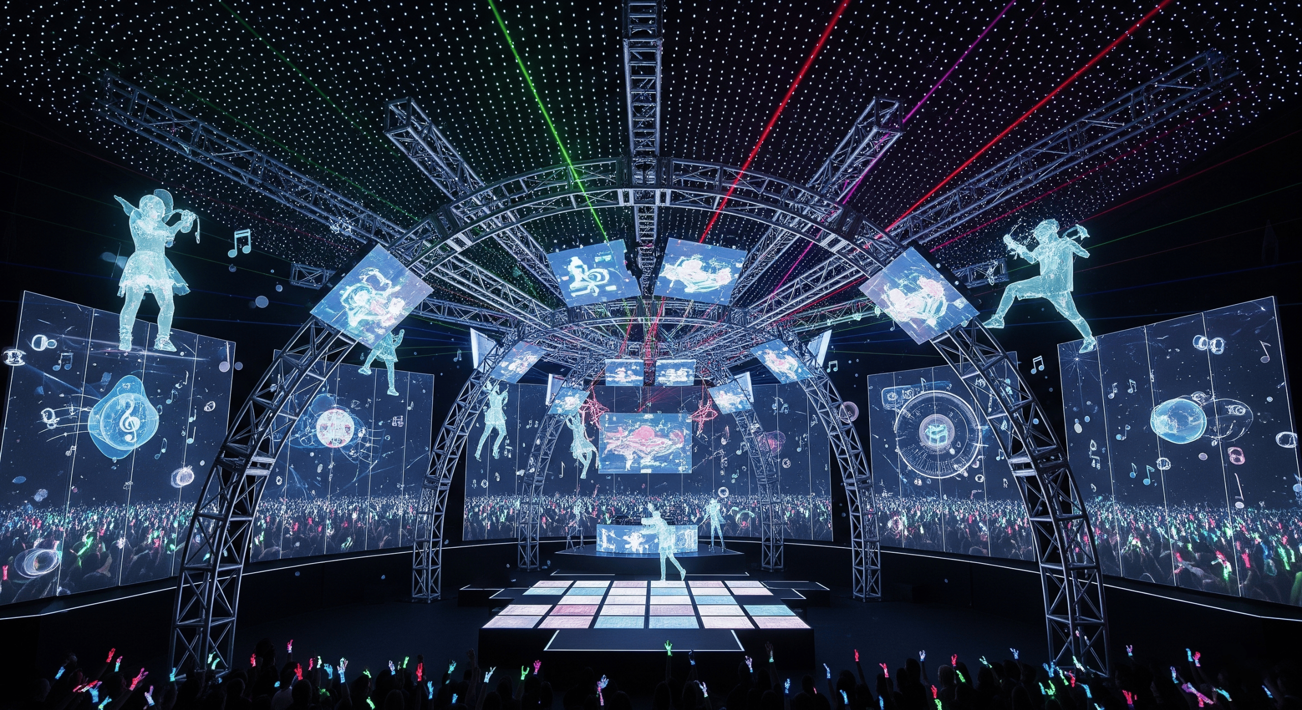 Automated lighting and stage platforms synchronized with audio for immersive experiences.
