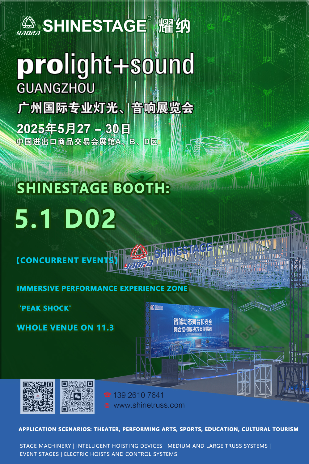 From May 27 to 30, 2025, the globally renowned Prolight + Sound Guangzhou 2025 will take place in Halls A, B, and D of the China Import and Export Fair Complex. As a leader in stage art design and intelligent stage solutions, Shinestage Technology will showcase its latest innovations at Booth D02, Hall 5.1, presenting its “one-stop stage technology solutions” to global audiences and driving the industry toward greater intelligence and safety.